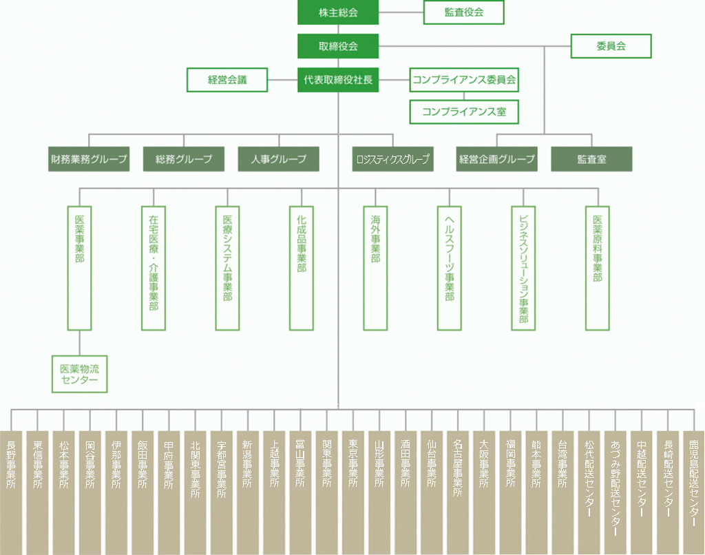 | 事業内容 | 医療用医薬品、医療・介護機器、基礎化学品、医薬原料、半導体薬品、 電子材料、樹脂、設備機器、食品原材料、食品添加物、食品包装資材、 OA機器コンピュータの販売、及び取扱い品目の輸出入など。 |